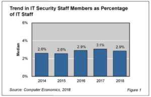 As shown in Figure 1 from our full report, IT Security Staffing Ratios, IT security staff members declined to 2.9% of the total IT staff at the median in 2018, on par with the percentage in 2016, and down slightly from last year. Previously, the ratio was stable from 2013-2015 at 2.6%.